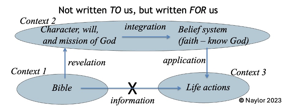 Instead, we approach Scripture as God’s self-revelation—his nature, will, and mission—communicated in a time, place, and cultural setting different from our own (left arrow—revelation). From that revelation, we develop a theological understanding of who God is and what he desires (top arrow—integration). Only then can we express our obedience in culturally appropriate actions today (right arrow—application).